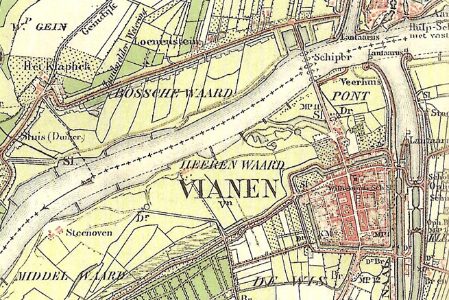 De Schipbrug bij Vianen op de Bonnekaart van omstreeks 1900.